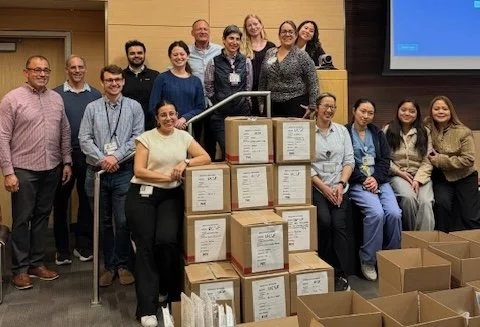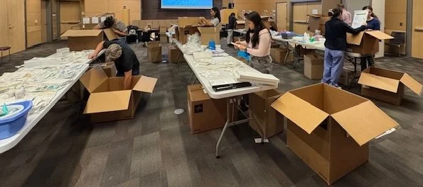 For several hours, that space transformed. Boxes were opened. Supplies were sorted. And what once felt like excess began to reveal something else entirely: a network coming to life. Who participated? UCSF staff, from engineering to sustainability to food services, family members, UCSF medical school students, even a UCSF patient who saw it posted on the electronic banner in the lobby and thought it would be cool!